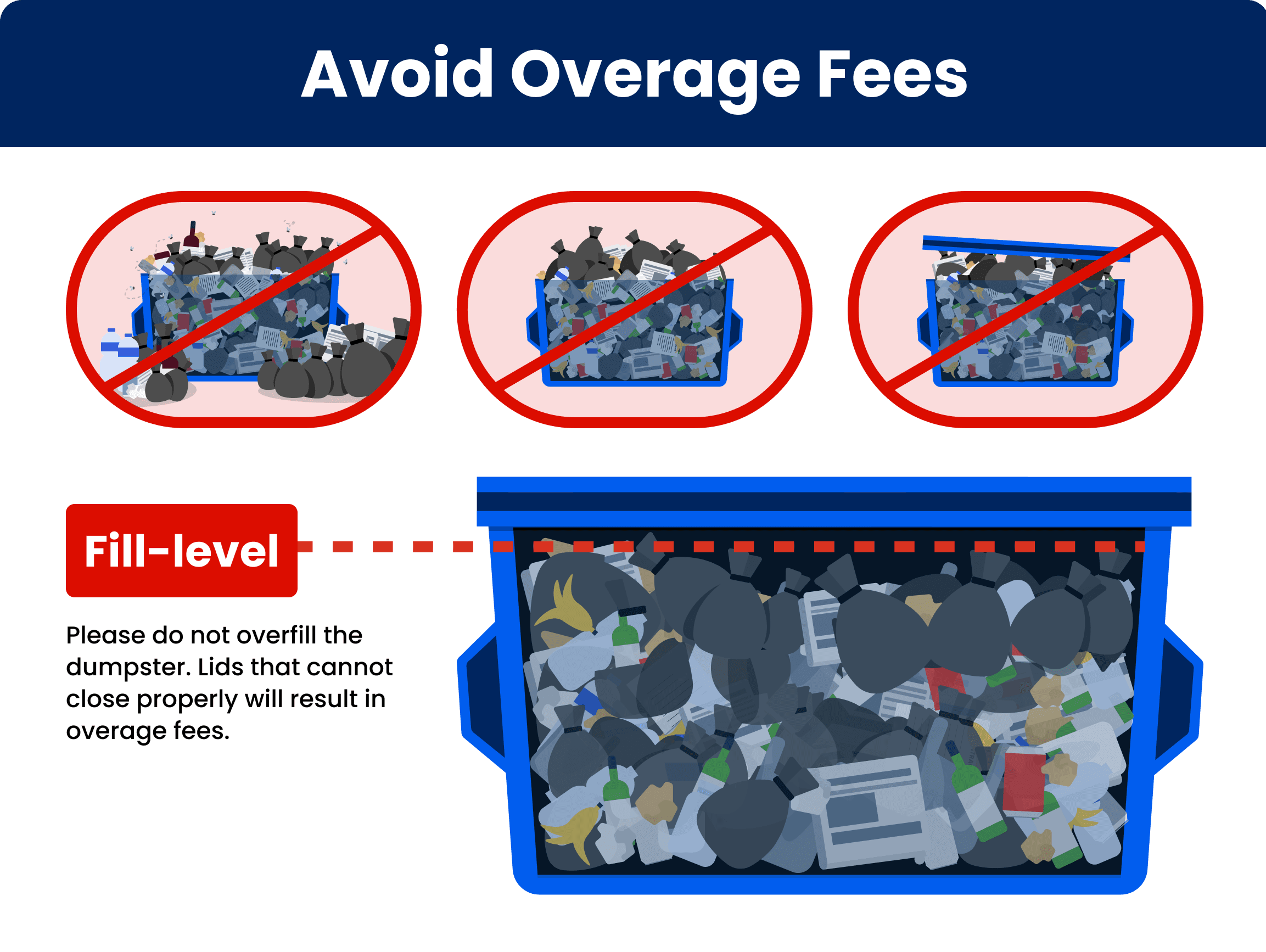 Your collection fees are calculated based on the size of your dumpster. Overfilling your dumpster may result in Overage charges, which can add up unexpectedly. Excessively filled containers can create safety risks for our drivers and lead to messes at your business.
