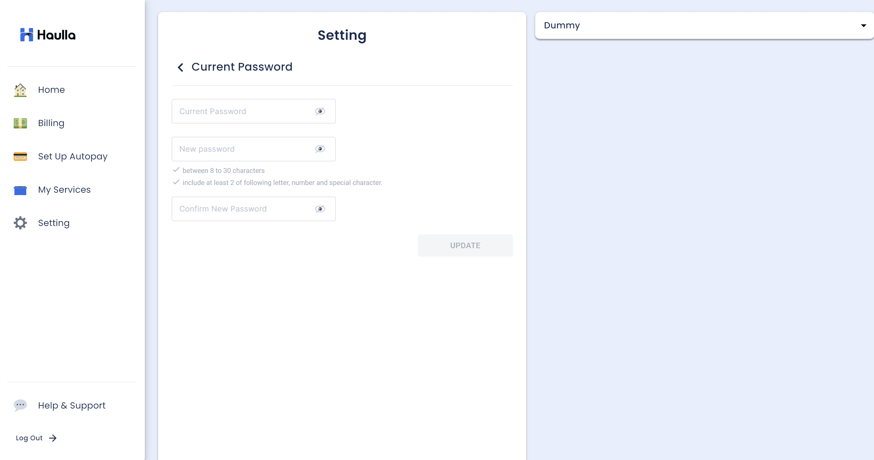 Input new password again to confirm new password in the 3rd input box. If the confirmed new password differs from the new password, an error is displayed and the Update button will not be activated