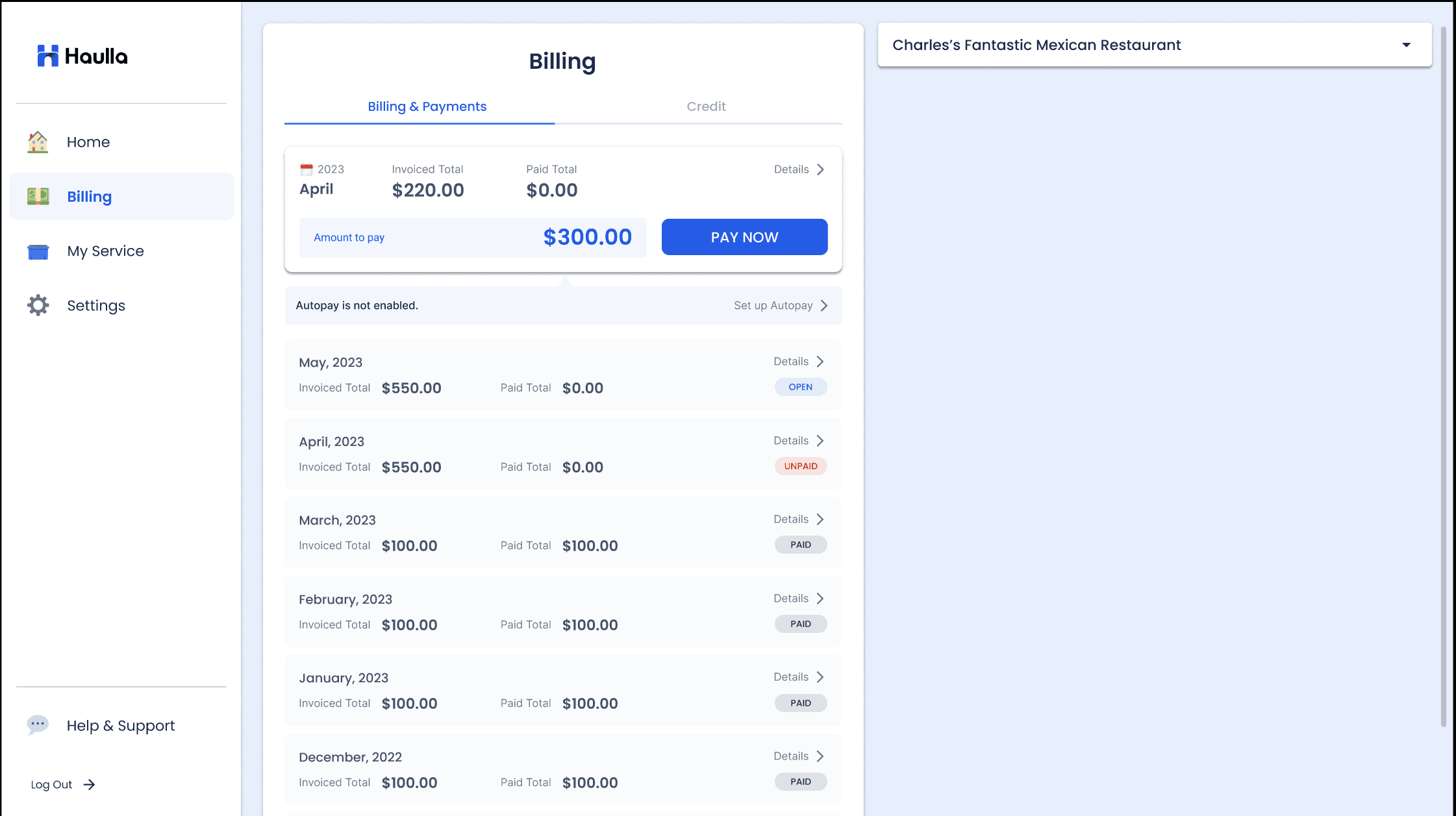 On the Billing & Payments screen, click the detail button on the unpaid invoice you want to check