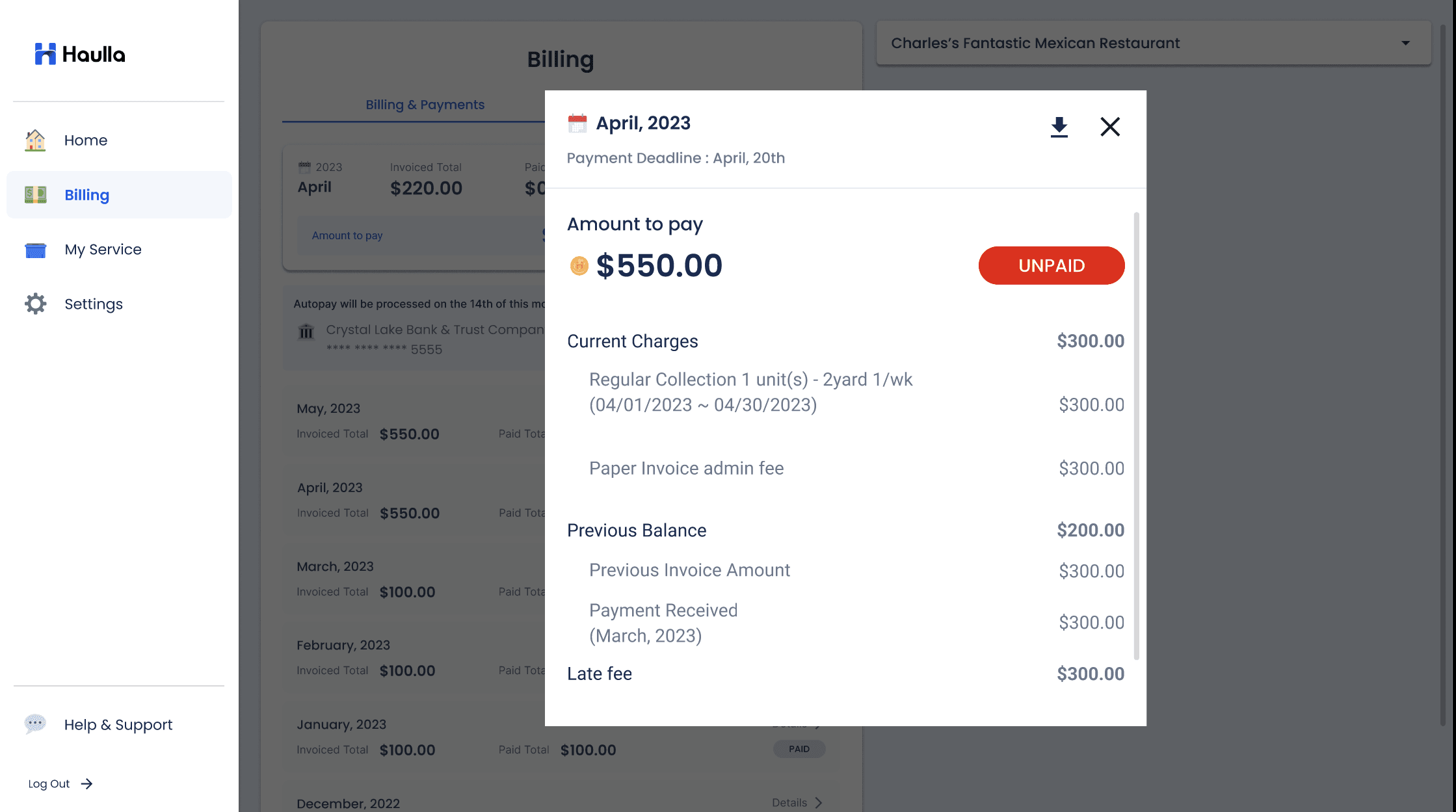 Service fees for the previous month that have not been settled will be charged in addition to the next month's bill by default. If you still have an invoice marked unpaid on the Billing & Payments screen, you can pay for it by paying the entire bill for this month.