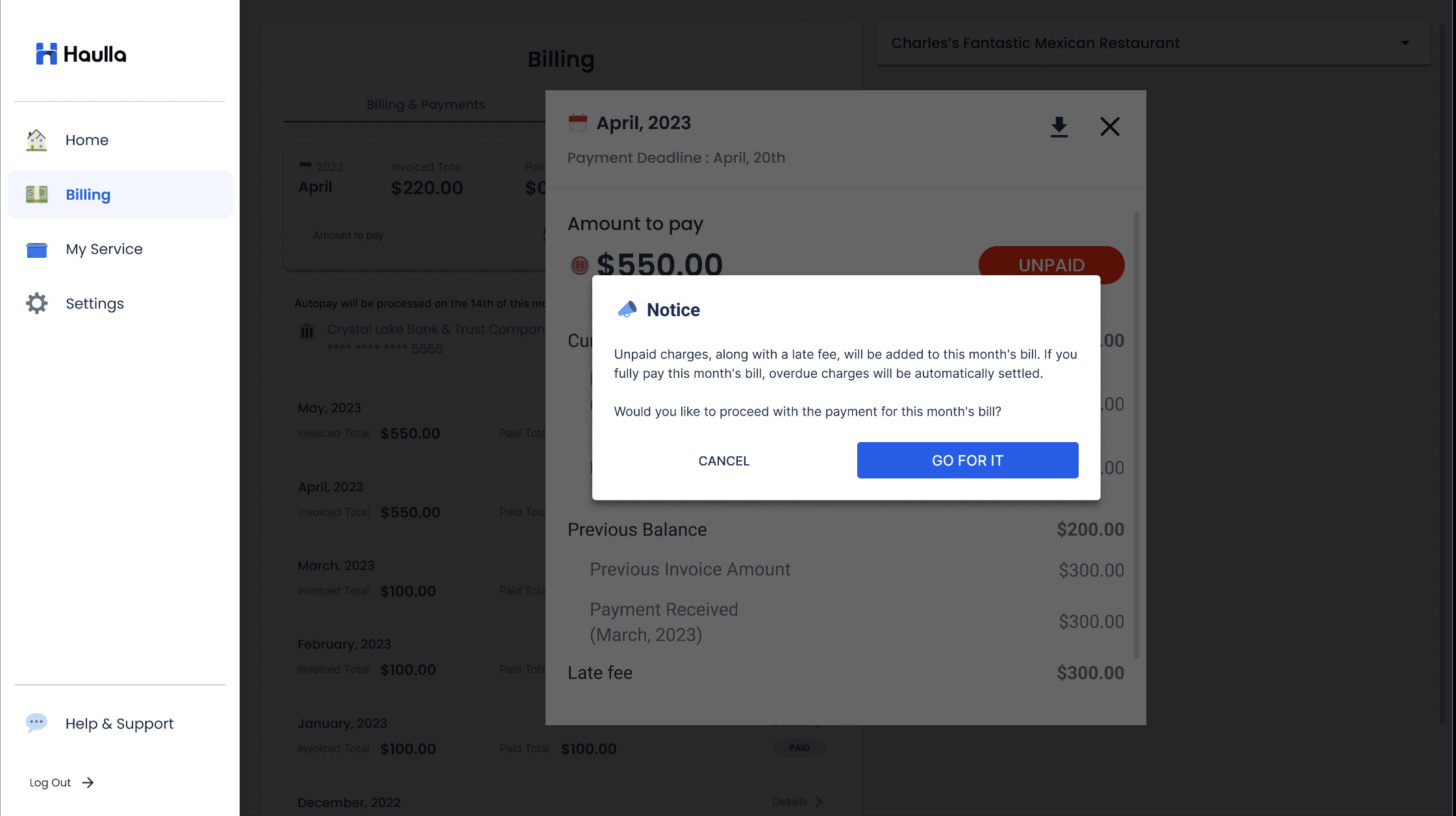 Before moving to the detail page for this month's bill, there will be a dialog shown for asking you that you willing to pay for the overdue charges.