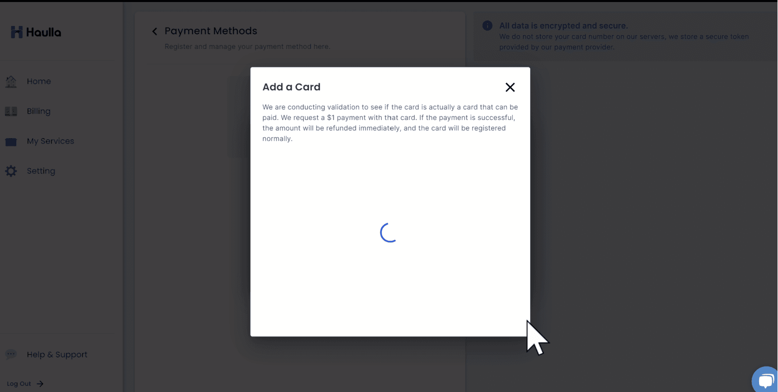 • When you press the 'Add' button, an immediate validation check is conducted on the card. A loading screen will be displayed during the validation process. Even if you close or navigate away from the loading screen, the processing for the requested card registration will continue.