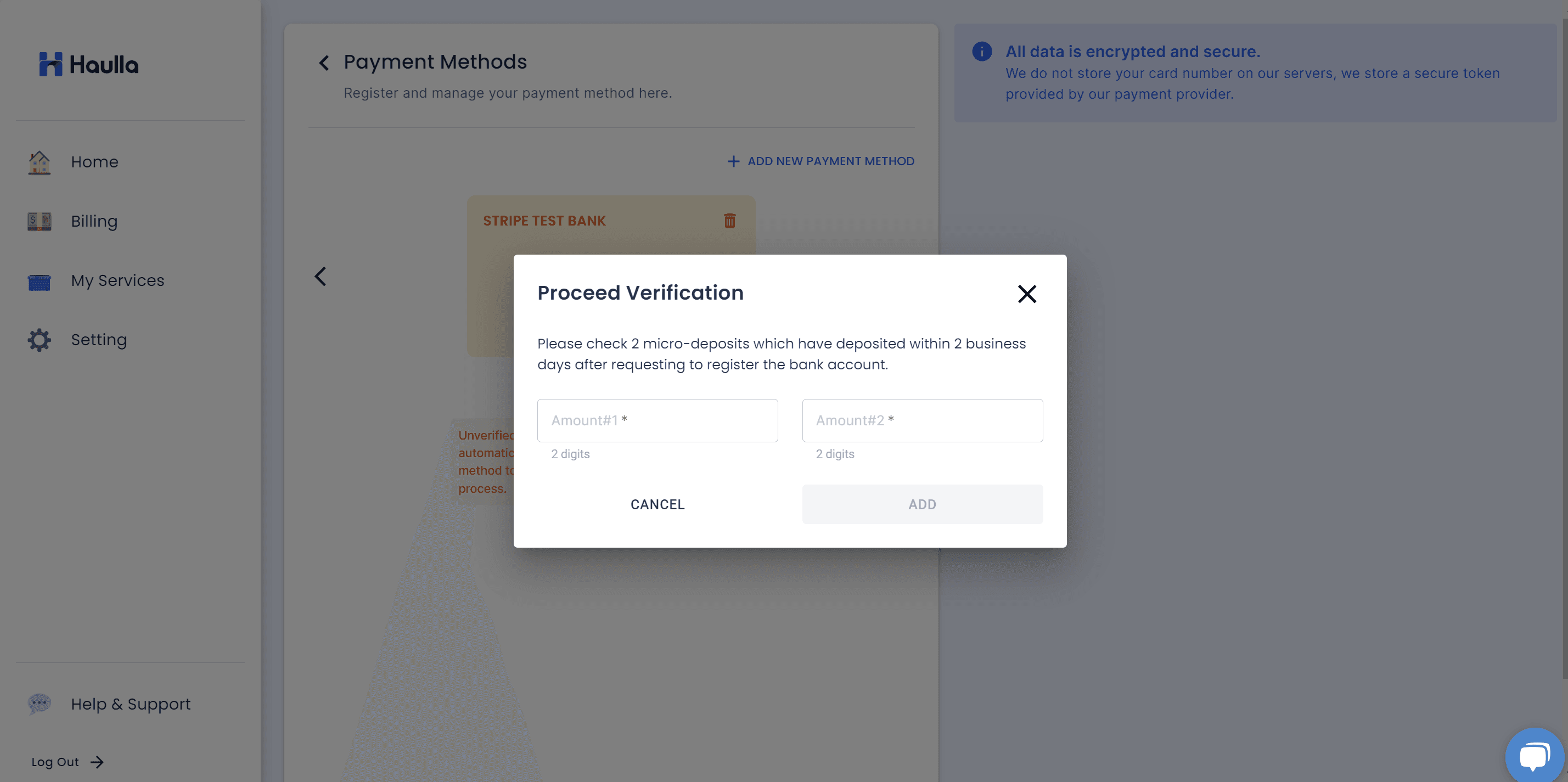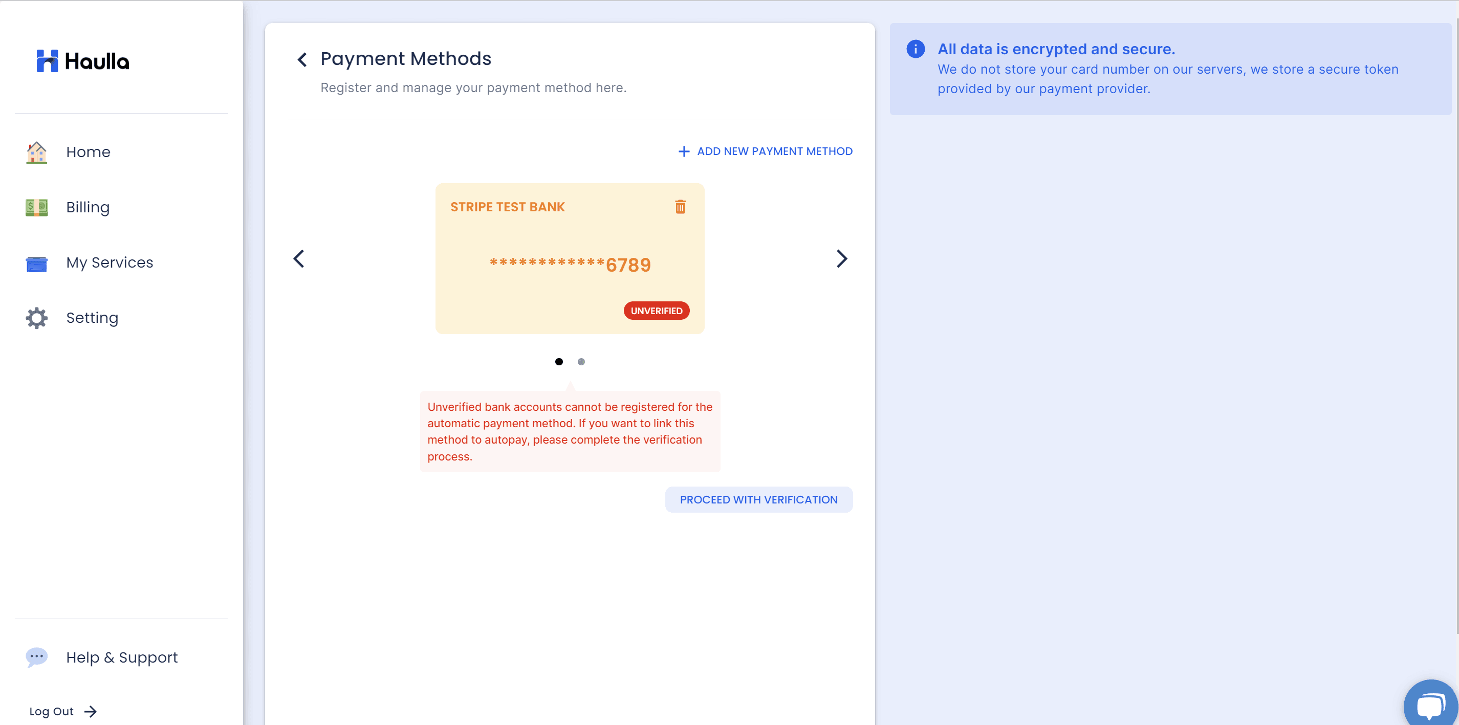 You can check all the registered payment methods on the Payment Methods screen. The unverified payment method will be shown like this. Please click proceed with verification button.