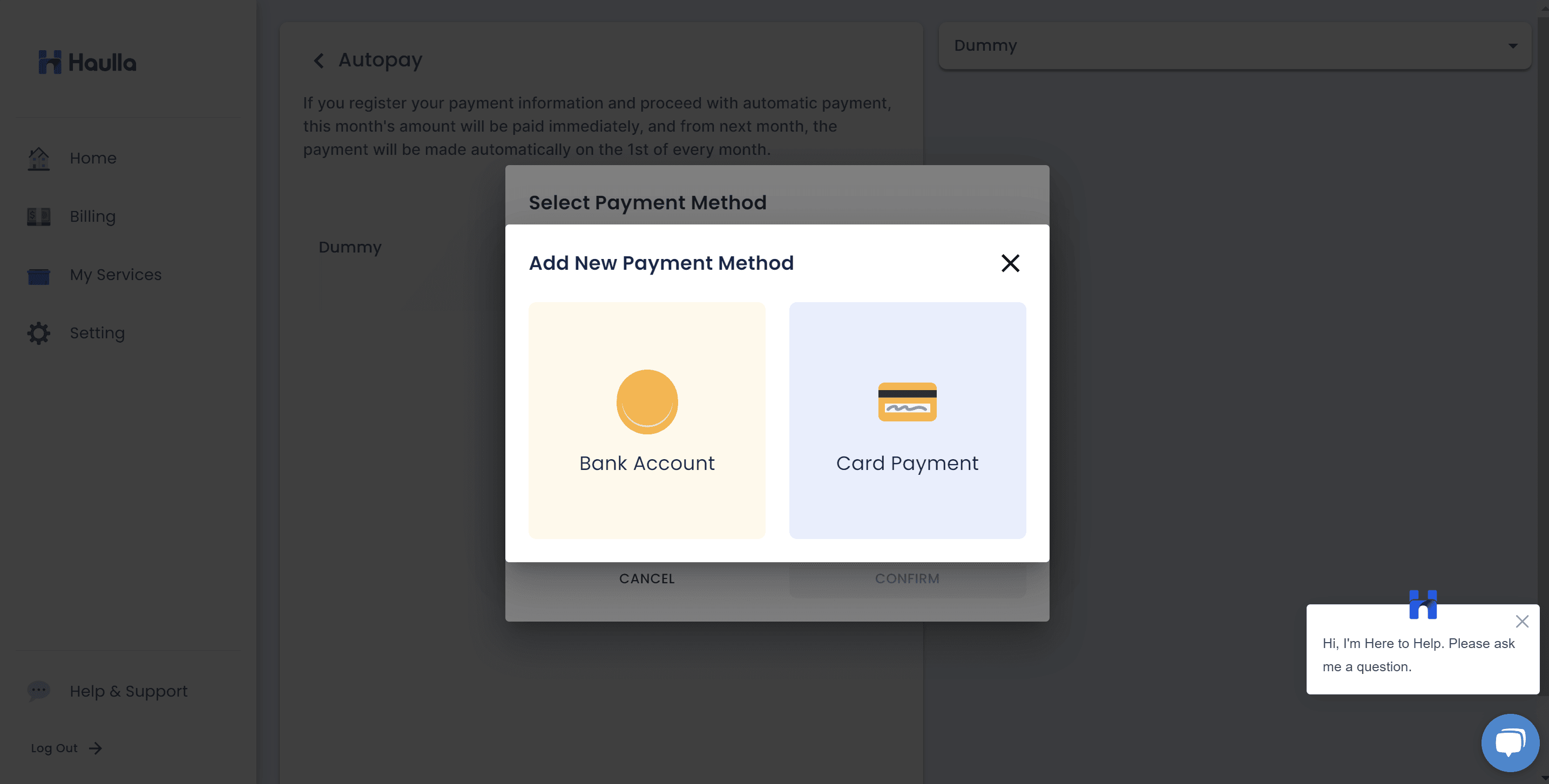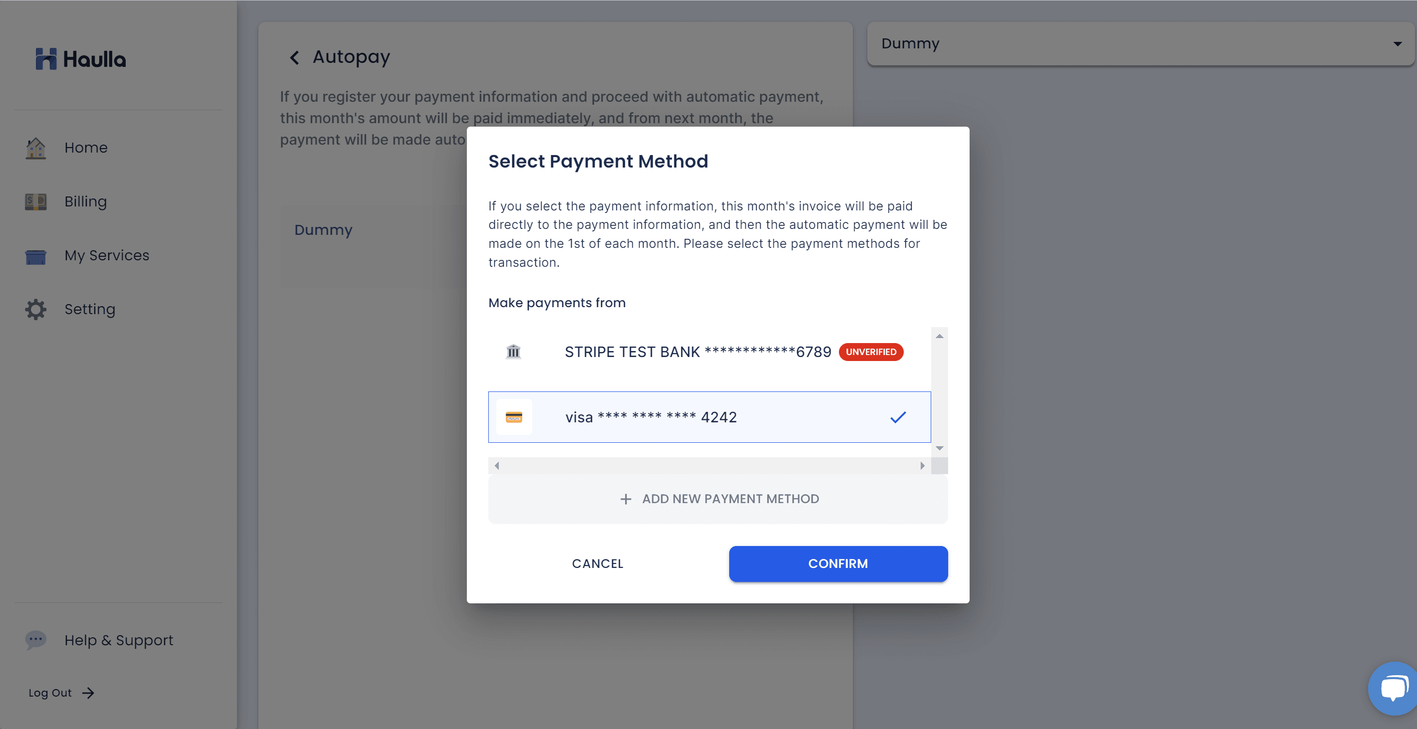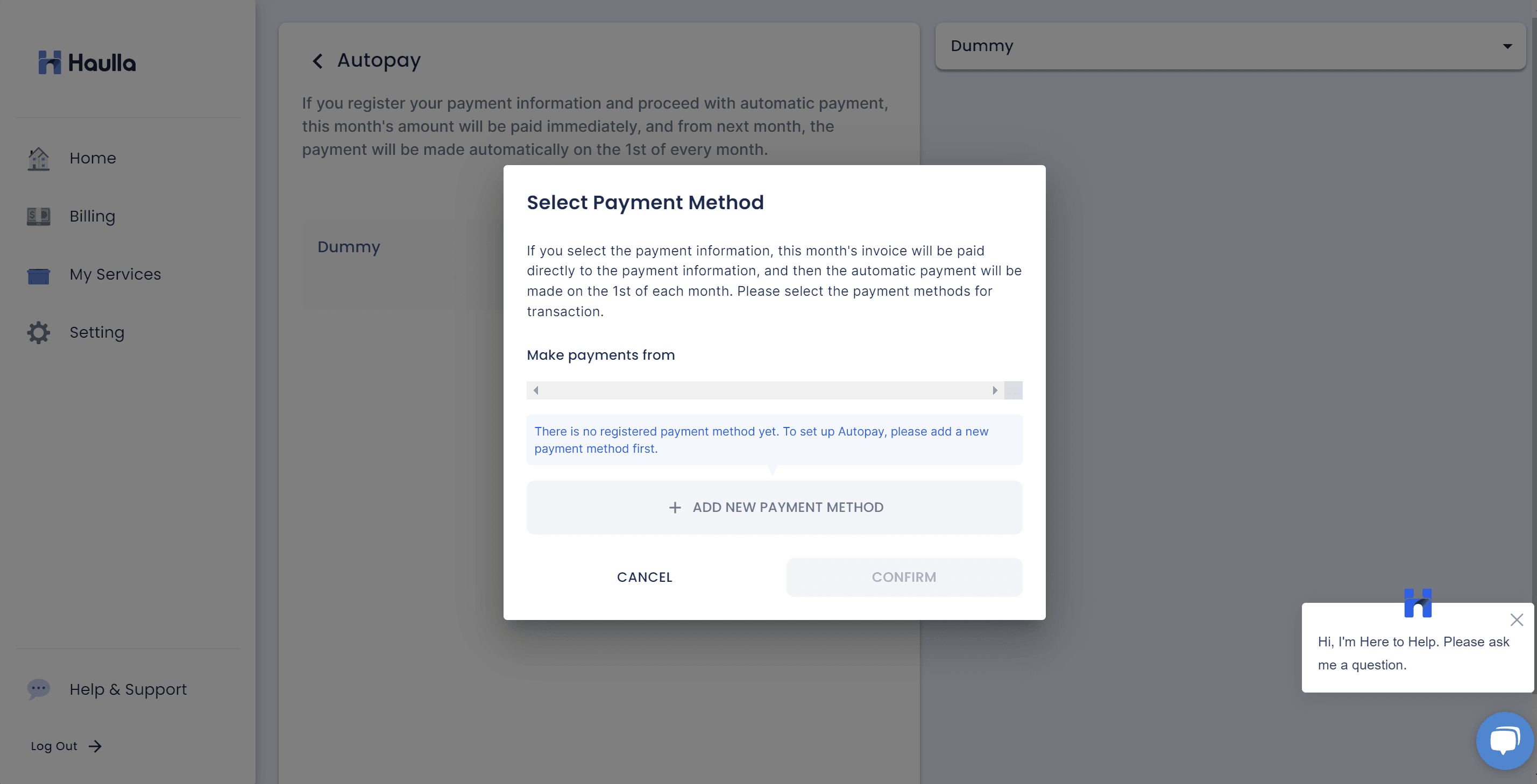 When you click start autopay button, the dialog for selecting payment method for your auto-payment will be shown. To register autopay, first you need to register your payment method.
