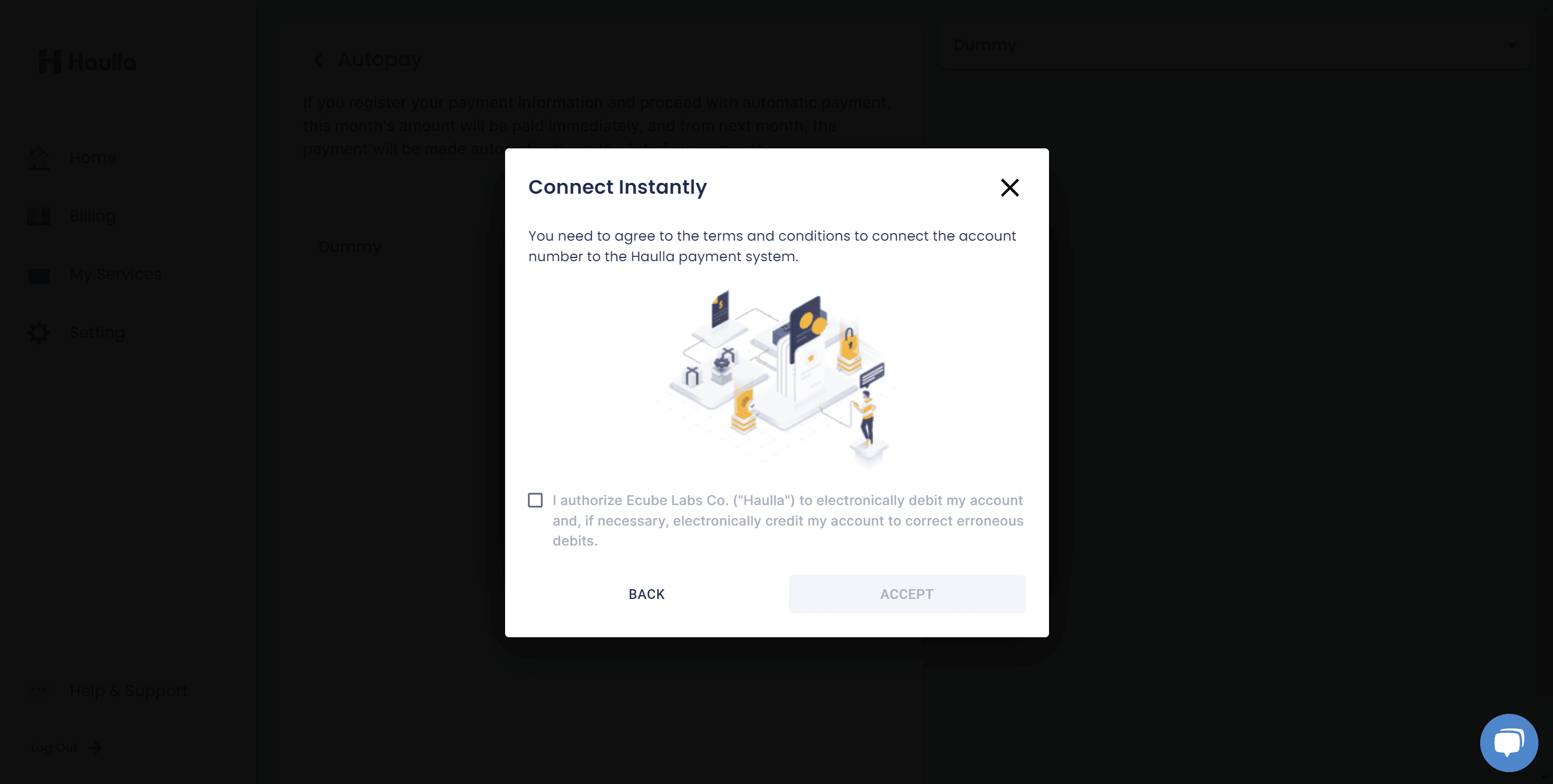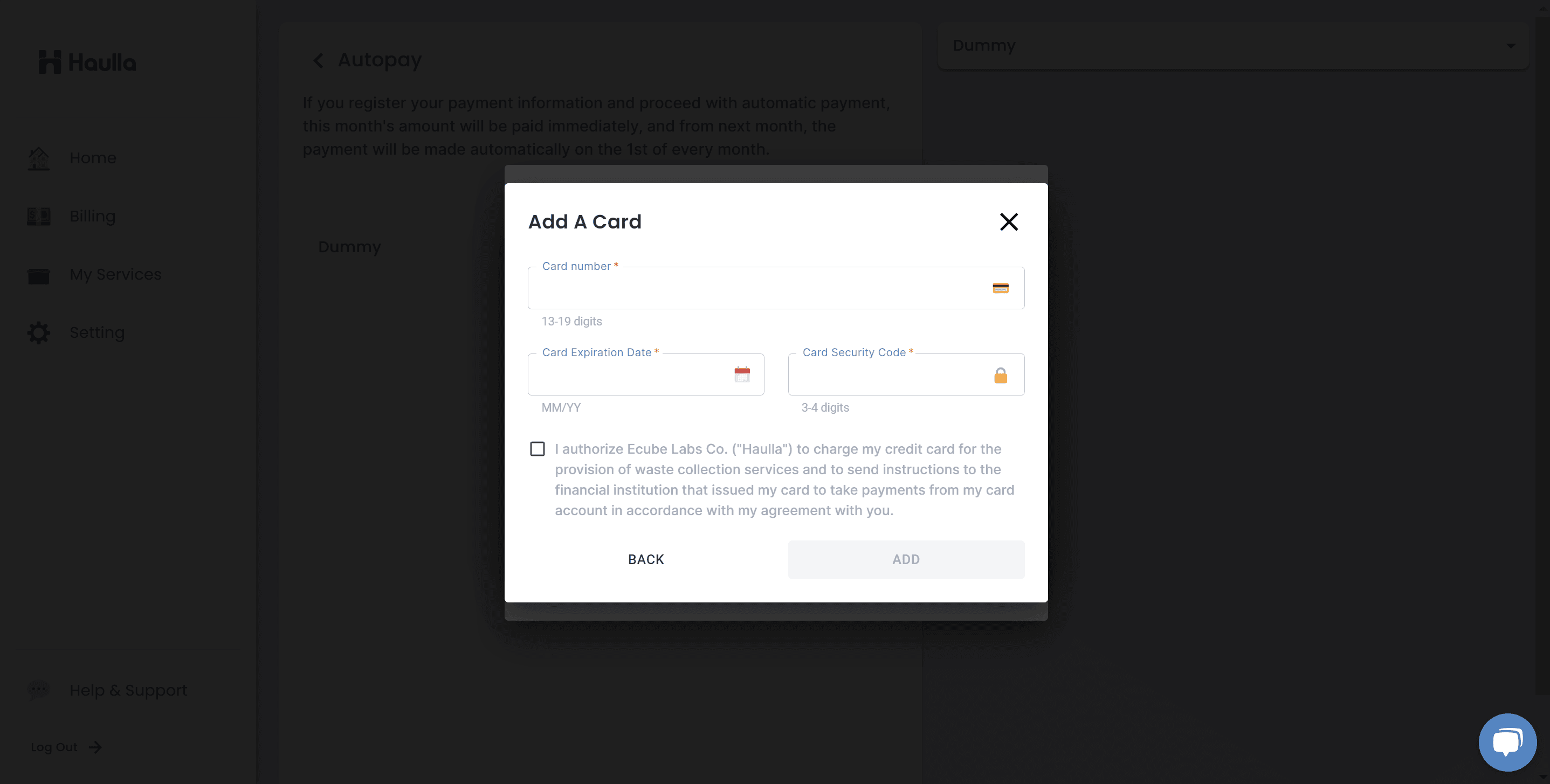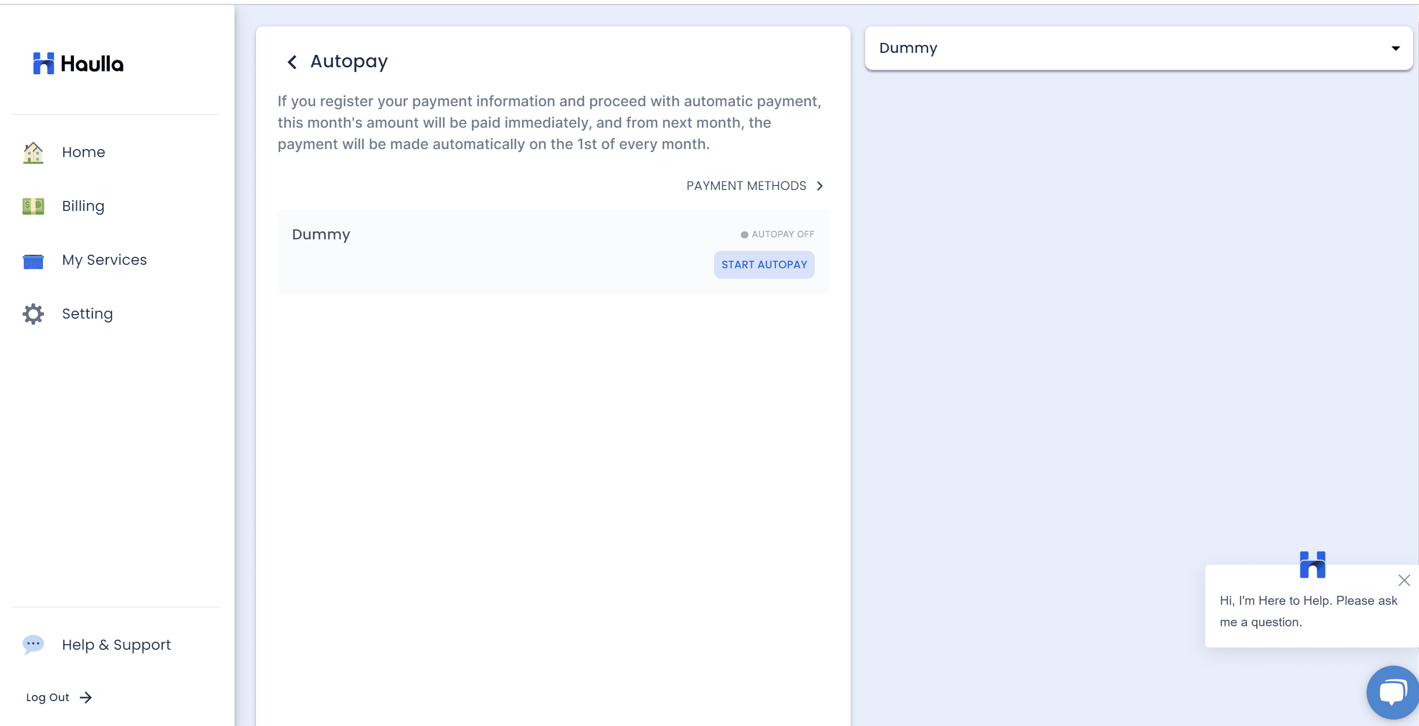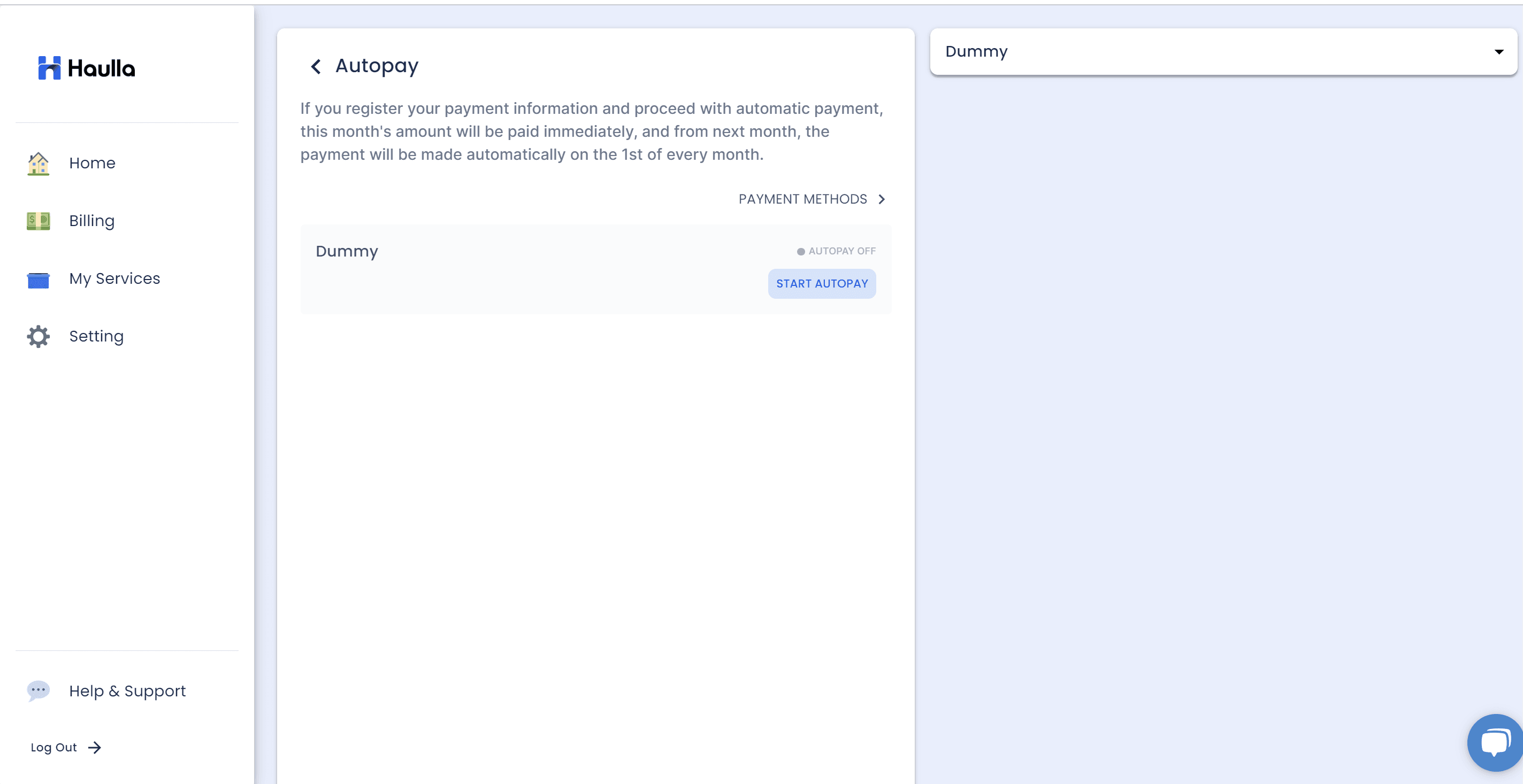 When you click start autopay button, the dialog for selecting payment method for your auto-payment will be shown. To register autopay, first you need to register your payment method.