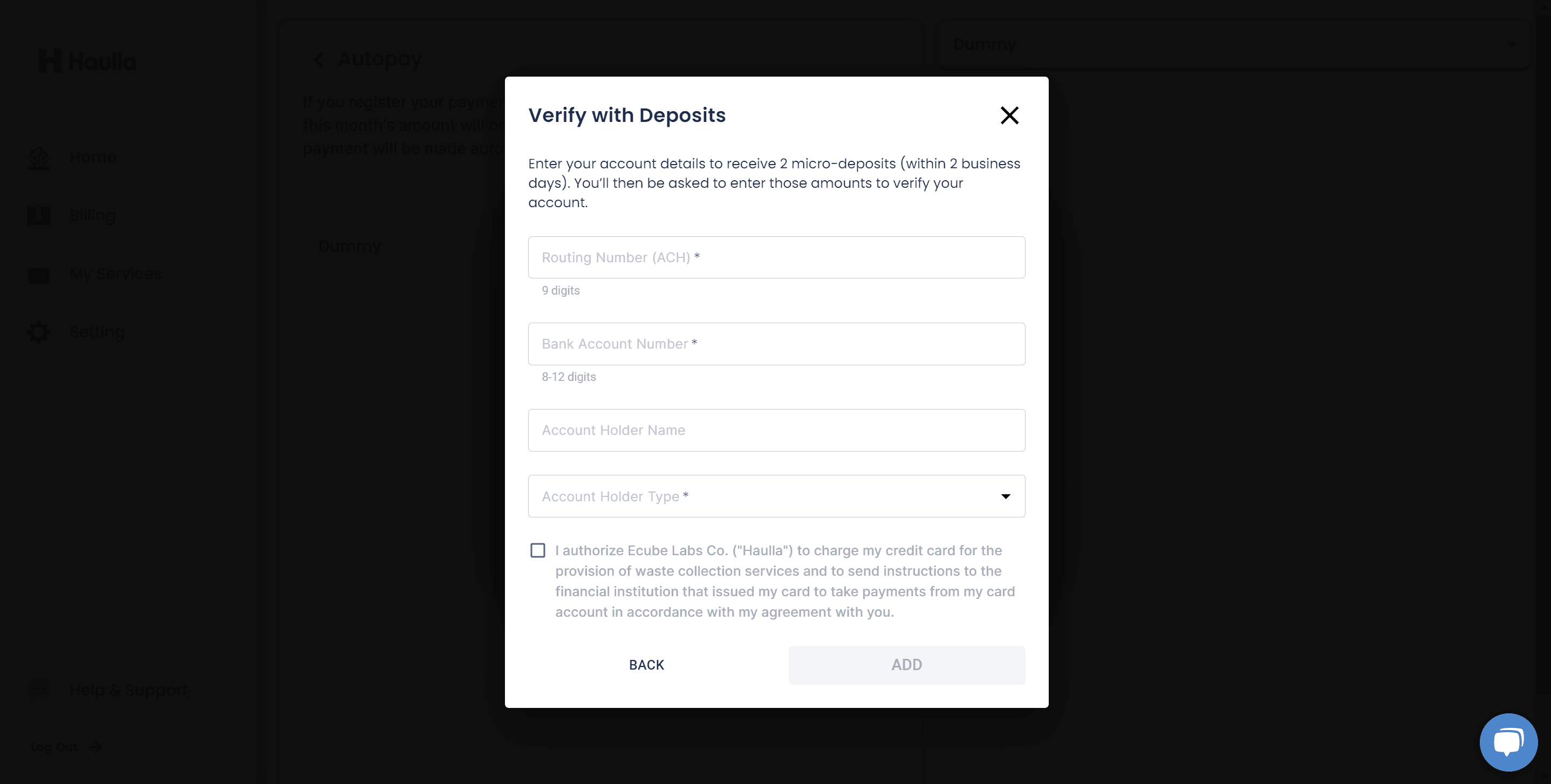 • For bank accounts that require authentication through the deposit amount, the unverified status is displayed next to the account. You cannot register the unverified payment method for your autopay. If you want to register unverified payment method for your autopay, you need to verify it first.