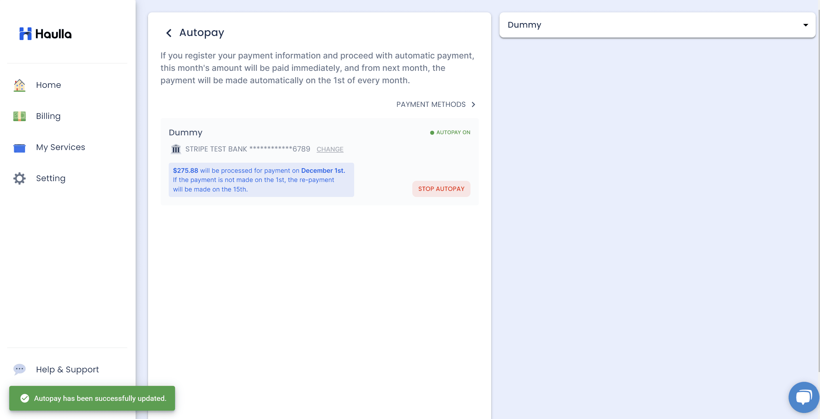 The current month's invoice will be immediately processed for payment when you press the confirm button, and starting from the next month, Autopay transactions will take place on the 1st of every month. If Autopay fails to successfully process on the 1st, a retry may be initiated on the 15th.