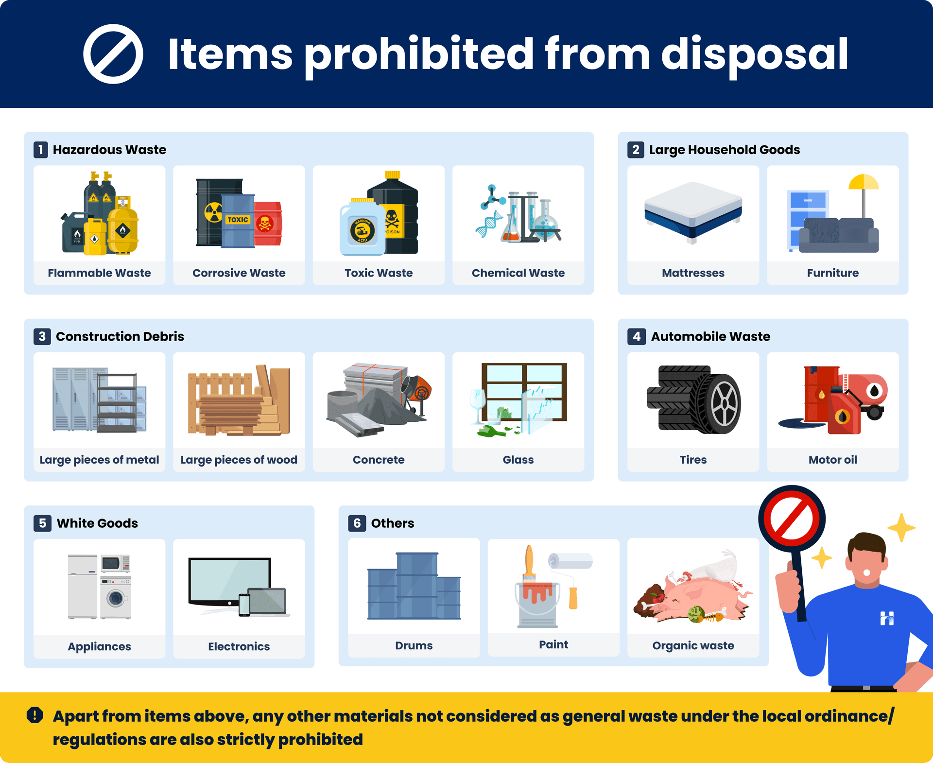 The following items are prohibited from being disposed of in General/Recycling/Organic dumpsters: